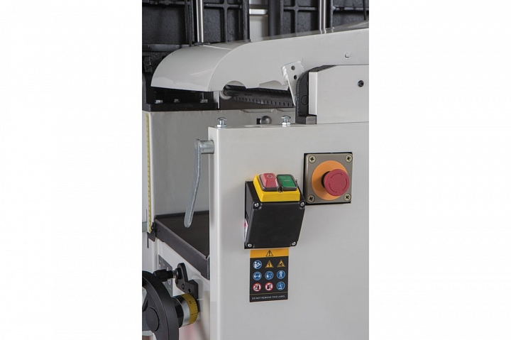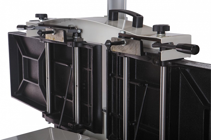 Для перехода от фугования к рейсмусованию достаточно поднять верхний модуль, состоящий из столов и рамы и переустановить кожух стружкоотсоса, сделанные ранее настройки при этом не сбиваются. Такая конструкция дает преимущества как в работе, так и при обслуживании станка.