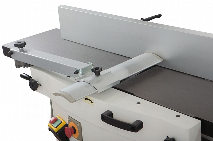 По основным характеристикам и удобству работы этот комбинированный станок не уступает отдельным рейсмусу и фуганку. Длинные и массивные чугунные столы создают базу, достаточную для работы с деталями длиной до 2-3 метров. Относительно специализированного станка несколько облегчен фуговальный упор: он не из чугуна, а из алюминиевого профиля. С другой стороны, эти модели обладают редким достоинством: удобную эксцентриковую регулировку по высоте имеет не только подающий, но и принимающий стол. Это необходимо, прежде всего, при замене строгального вала на helical, режущие пластины которого не регулируются по высоте.