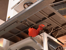 Рабочий стол чугунный. Трапеция опорно-поворотной цапфы также чугунная. Поворотные полукольца – стальные, из действительно толстой стали, мощные и устойчивые к вибрациям и износу. Наклон производится при помощи зубчатого механизма вращением рукоятки в обе стороны (на 5° в сторону станка и на 45° от него). Эффективное пылеудаление с обеих сторон ведущего колеса. Устроено оно двумя 100-миллиметровыми патрубками: один под рабочей поверхностью, второй в нижней части корпуса.