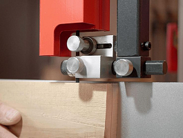 Натяжение ленты на колесах одним движением рычага. Большая ширина шкивов дает возможность установки широких пильных лент. Направление ленты при пилении двумя группами трехроликовых направляющих на шарикоподшипниках. Одна группа роликов расположена прямо над заготовкой и вторая – под столом. Стрелочный индикатор уровня натяжения поможет выбрать предварительный натяг пильной ленты. Отрегулировать натяжение до требуемого можно при помощи маховика на корпусе пилы под верхним/ведущим шкивом. Через смотровое окно необходимо проследить при первичной установке за сбеганием ленты. Лента должна находиться по центру и сбегание ее в любую из сторон недопустимо. Плавность хода и пиление без вибраций обеспечат чугунные шкивы с массивным телом. Они отбалансированы на заводе-изготовителе с использованием стендов компьютерной балансировки.