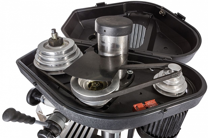 Моторная группа станка имеет мощный асинхронный двигатель - 1,5 кВт, имеющий функцию реверса. Благодаря реверсу шпиндель может вращаться вправо и влево. Наличие ременной передачи с концевым выключателем, позволяет выполнять обработку в 12-ти скоростных режимах. Частота диапазона вращения шпинделя составляет 125-2500 об/мин. Крестовый стол с 3-мя Т-образными пазами шириной 16 мм, позволяют выполнять установку дополнительной оснастки. Рабочий стол оснащен прецизионным механизмом.